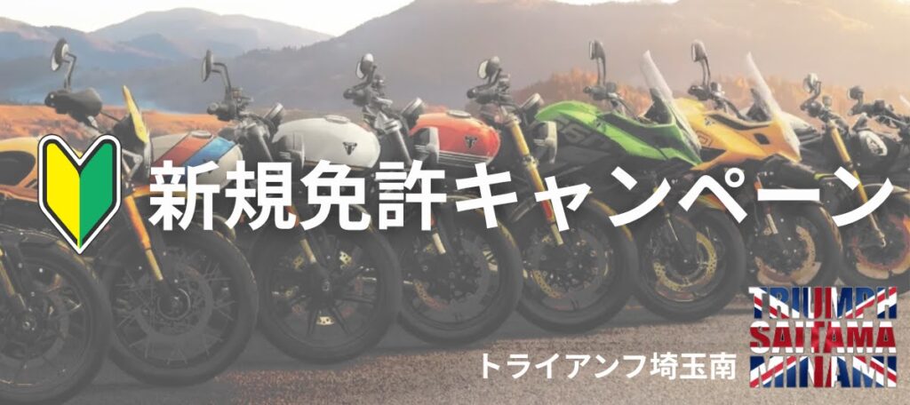 投稿公開日:2026年2月14日 投稿カテゴリー:新車 トライアンフ埼玉南オリジナルキャンペーン 対象機種:トライアンフ新車(400㏄シリーズ除く) 内容:大型二輪免許を1年以内に取得した方で、トライアンフ埼玉南にてトライアンフの新車をご購入の場合 3万円~5万円の免許サポートを実施中。 ※サポート額は機種により変わります。 ※他当社キャンペーンとの併用が出来ない場合がございます。詳しくはお問い合わせ下さい。